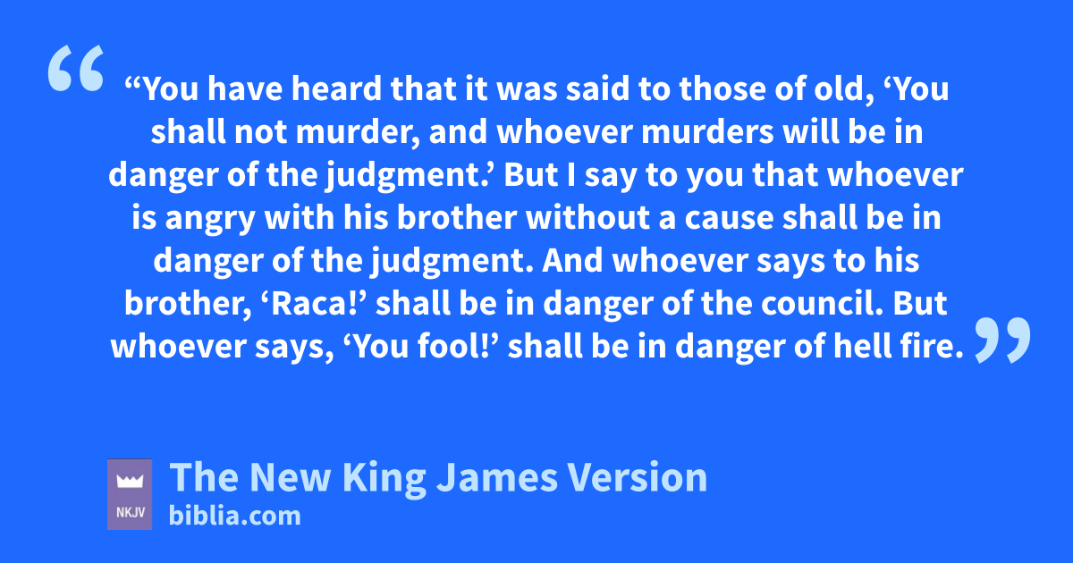 21 “You have heard that it was said to those 4of old, z‘You shall not murder, and whoever murders will be in danger of the judgment.’ 22 But I say to you that awhoever is angry with his brother 5without a cause shall be in danger of the judgment. And whoever says to his brother, b‘Raca!’ 6shall be in danger of the council. But whoever says, 7‘You fool!’ shall be in danger of 8hell fire. 23 Therefore cif you bring your gift to the altar, and there remember that your brother has something against you, 24 dleave your gift there before the altar, and go your way. First be reconciled to your brother, and then come and offer your gift. 25 eAgree with your adversary quickly, fwhile you are on the way with him, lest your adversary deliver you to the judge, the judge hand you over to the officer, and you be thrown into prison. 26 Assuredly, I say to you, you will by no means get out of there till you have paid the last penny.