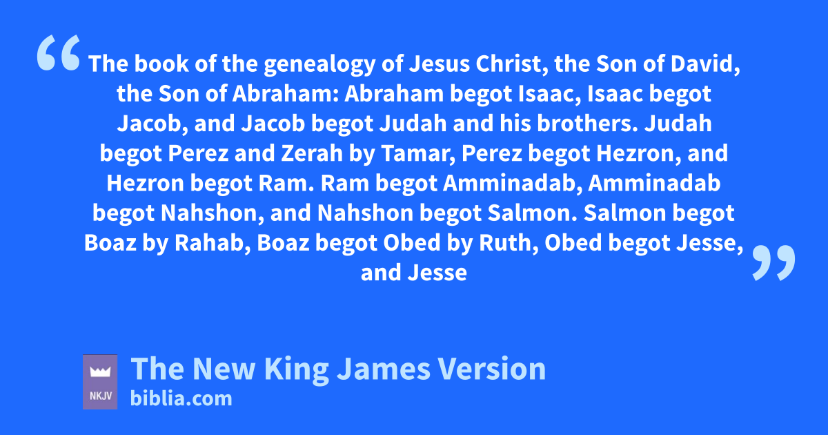 2 dAbraham begot Isaac, eIsaac begot Jacob, and Jacob begot fJudah and his brothers. 3 gJudah begot Perez and Zerah by Tamar, hPerez begot Hezron, and Hezron begot Ram. 4 Ram begot Amminadab, Amminadab begot Nahshon, and Nahshon begot Salmon. 5 Salmon begot iBoaz by Rahab, Boaz begot Obed by Ruth, Obed begot Jesse, 6 and jJesse begot David the king.