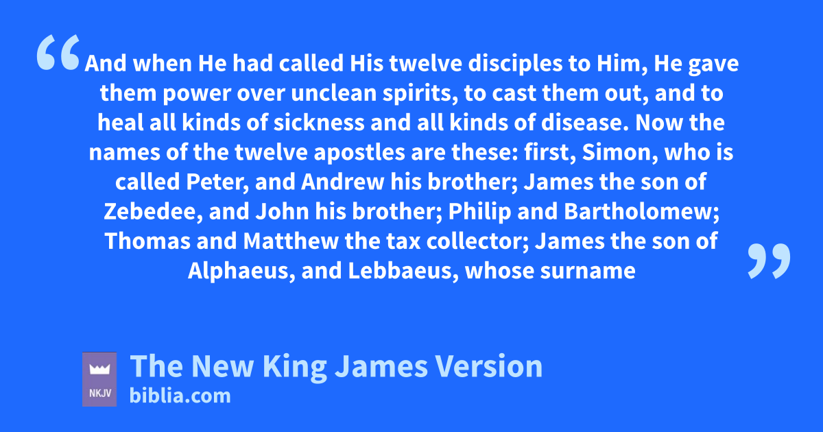 10 And awhen He had called His twelve disciples to Him, He gave them power over unclean spirits, to cast them out, and to heal all kinds of sickness and all kinds of disease. 2 Now the names of the twelve apostles are these: first, Simon, bwho is called Peter, and Andrew his brother; James the son of Zebedee, and John his brother; 3 Philip and Bartholomew; Thomas and Matthew the tax collector; James the son of Alphaeus, and 1Lebbaeus, whose surname was Thaddaeus; 4 cSimon the 2Cananite, and Judas dIscariot, who also betrayed Him.
