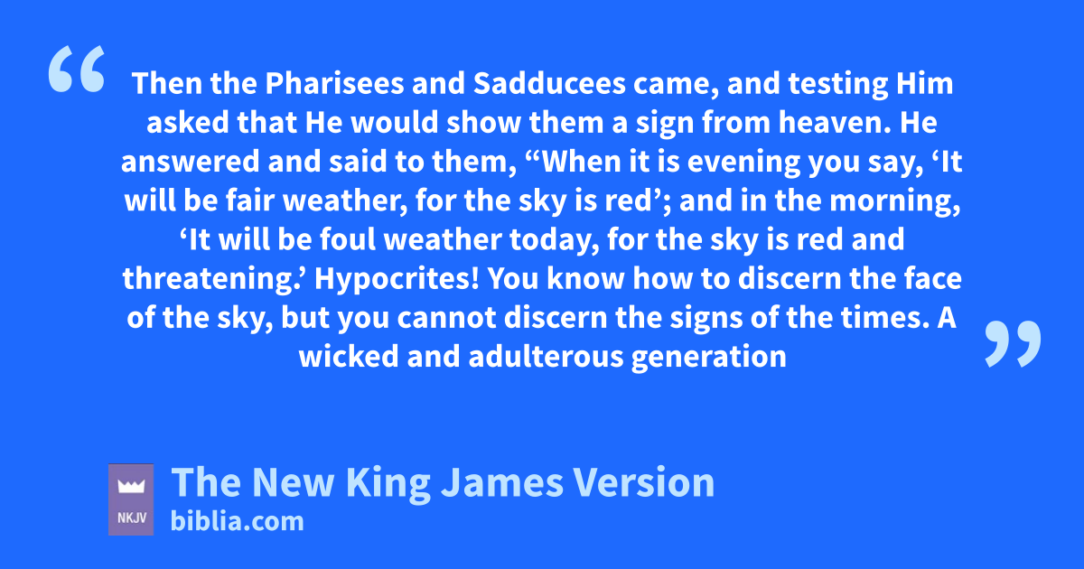 16 Then the aPharisees and Sadducees came, and testing Him asked that He would show them a sign from heaven. 2 He answered and said to them, “When it is evening you say, ‘It will be fair weather, for the sky is red’; 3 and in the morning, ‘It will be foul weather today, for the sky is red and threatening.’ 1Hypocrites! You know how to discern the face of the sky, but you cannot discern the signs of the times. 4 bA wicked and adulterous generation seeks after a sign, and no sign shall be given to it except the sign of 2the prophet Jonah.” And He left them and departed.