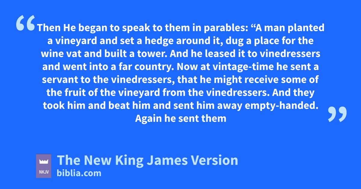 12 Then aHe began to speak to them in parables: “A man planted a vineyard and set a hedge around it, dug a place for the wine vat and built a tower. And he leased it to 1vinedressers and went into a far country. 2 Now at vintage-time he sent a servant to the vinedressers, that he might receive some of the fruit of the vineyard from the vinedressers. 3 And they took him and beat him and sent him away empty-handed. 4 Again he sent them another servant, 2and at him they threw stones, wounded him in the head, and sent him away shamefully treated. 5 And again he sent another, and him they killed; and many others, bbeating some and killing some. 6 Therefore still having one son, his beloved, he also sent him to them last, saying, ‘They will respect my son.’ 7 But those 3vinedressers said among themselves, ‘This is the heir. Come, let us kill him, and the inheritance will be ours.’ 8 So they took him and ckilled him and cast him out of the vineyard.