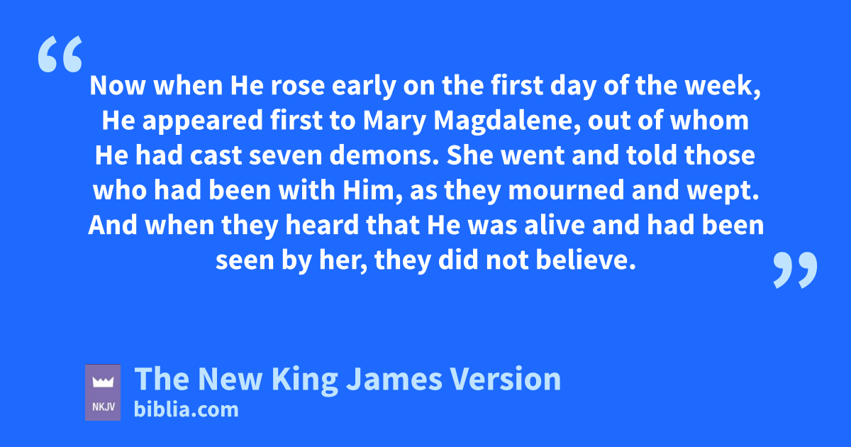 9 3Now when He rose early on the first day of the week, He appeared first to Mary Magdalene, hout of whom He had cast seven demons. 10 iShe went and told those who had been with Him, as they mourned and wept. 11 jAnd when they heard that He was alive and had been seen by her, they did not believe.