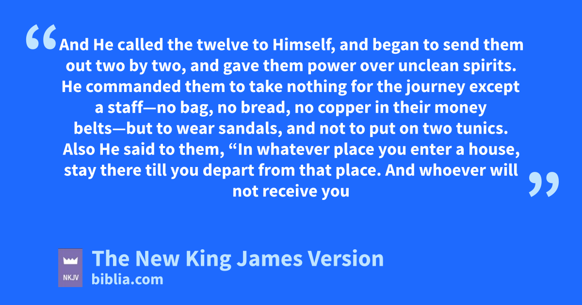 7 jAnd He called the twelve to Himself, and began to send them out ktwo by two, and gave them power over unclean spirits. 8 He commanded them to take nothing for the journey except a staff—no bag, no bread, no copper in their money belts—9 but lto wear sandals, and not to put on two tunics.