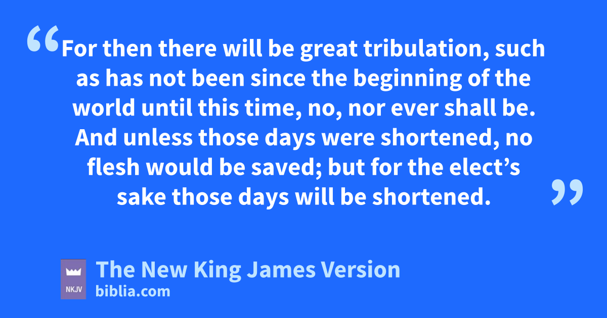 15 r“Therefore when you see the s‘abomination of desolation,’ spoken of by Daniel the prophet, standing in the holy place” t(whoever reads, let him understand), 16 “then let those who are in Judea flee to the mountains. 17 Let him who is on the housetop not go down to take anything out of his house. 18 And let him who is in the field not go back to get his clothes. 19 But uwoe to those who are pregnant and to those who are nursing babies in those days! 20 And pray that your flight may not be in winter or on the Sabbath. 21 For vthen there will be great tribulation, such as has not been since the beginning of the world until this time, no, nor ever shall be. 22 And unless those days were shortened, no flesh would be saved; wbut for the 3elect’s sake those days will be shortened.