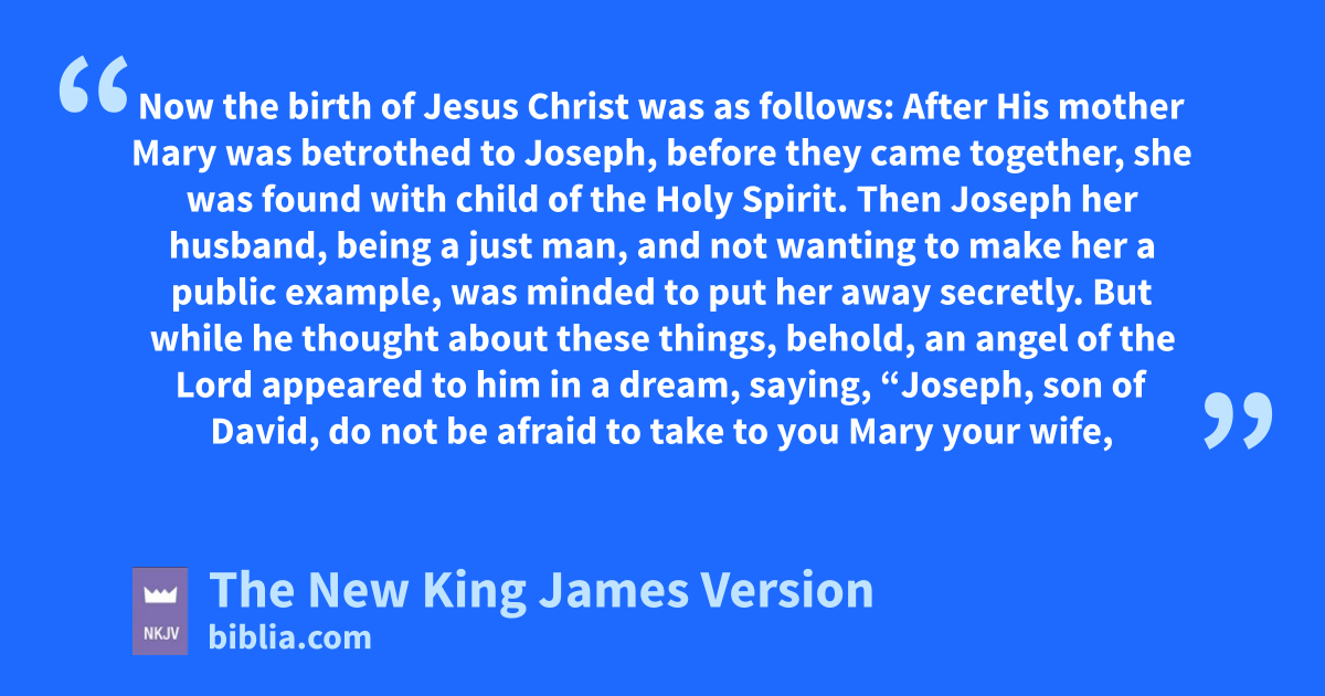 18 Now the xbirth of Jesus Christ was as follows: After His mother Mary was betrothed to Joseph, before they came together, she was found with child yof the Holy Spirit. 19 Then Joseph her husband, being 6a just man, and not wanting zto make her a public example, was minded to put her away secretly. 20 But while he thought about these things, behold, an angel of the Lord appeared to him in a dream, saying, “Joseph, son of David, do not be afraid to take to you Mary your wife, afor that which is 7conceived in her is of the Holy Spirit. 21 bAnd she will bring forth a Son, and you shall call His name 8Jesus, cfor He will save His people from their sins.”