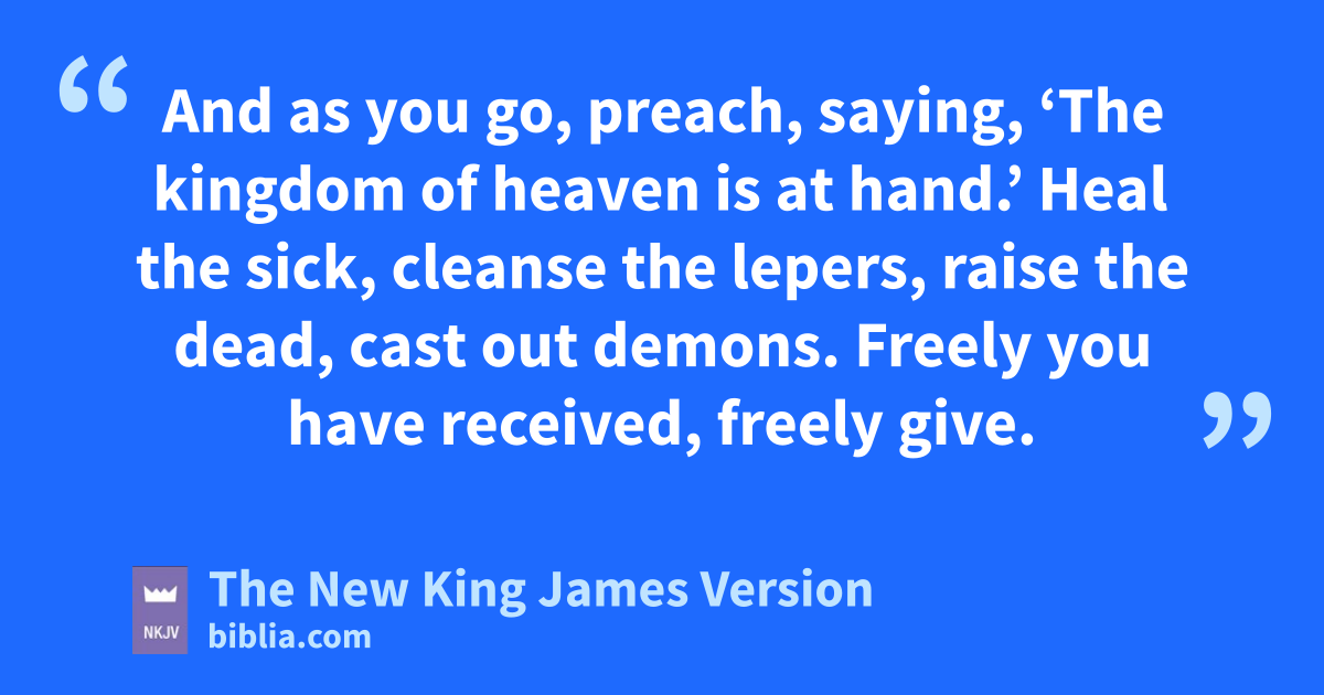 5 These twelve Jesus sent out and commanded them, saying: e“Do not go into the way of the Gentiles, and do not enter a city of fthe Samaritans. 6 gBut go rather to the hlost sheep of the house of Israel. 7 iAnd as you go, preach, saying, j‘The kingdom of heaven 3is at hand.’ 8 Heal the sick, 4cleanse the lepers, 5raise the dead, cast out demons. kFreely you have received, freely give. 9 lProvide neither gold nor silver nor mcopper in your money belts, 10 nor bag for your journey, nor two tunics, nor sandals, nor staffs; nfor a worker is worthy of his food.