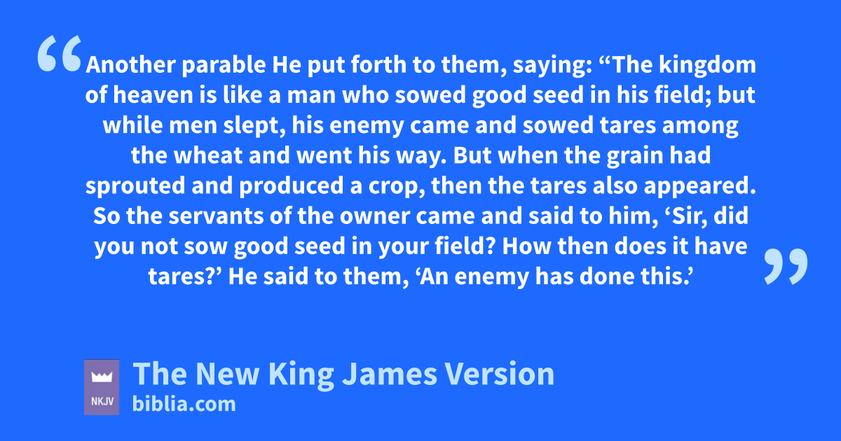 24 Another parable He put forth to them, saying: “The kingdom of heaven is like a man who sowed good seed in his field; 25 but while men slept, his enemy came and sowed tares among the wheat and went his way. 26 But when the grain had sprouted and produced a crop, then the tares also appeared. 27 So the servants of the owner came and said to him, ‘Sir, did you not sow good seed in your field? How then does it have tares?’ 28 He said to them, ‘An enemy has done this.’ The servants said to him, ‘Do you want us then to go and gather them up?’ 29 But he said, ‘No, lest while you gather up the tares you also uproot the wheat with them. 30 Let both grow together until the harvest, and at the time of harvest I will say to the reapers, “First gather together the tares and bind them in bundles to burn them, but xgather the wheat into my barn.” ’ ”