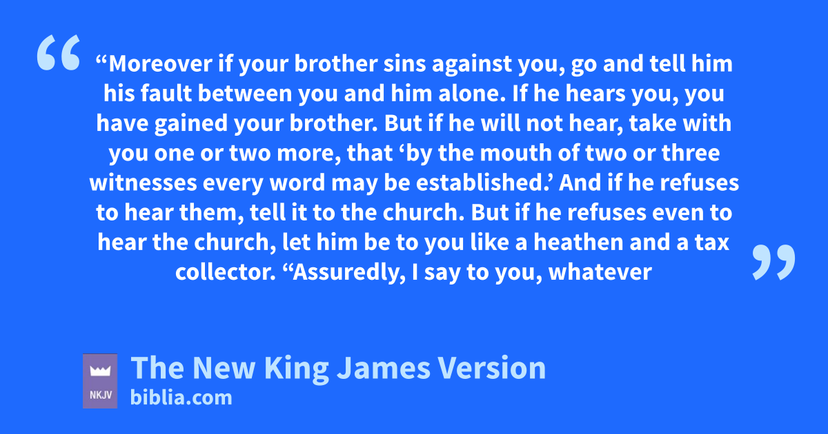 15 “Moreover oif your brother sins against you, go and tell him his fault between you and him alone. If he hears you, pyou have gained your brother. 16 But if he will not hear, take with you one or two more, that q‘by the mouth of two or three witnesses every word may be established.’ 17 And if he refuses to hear them, tell it to the church. But if he refuses even to hear the church, let him be to you like a rheathen and a tax collector.