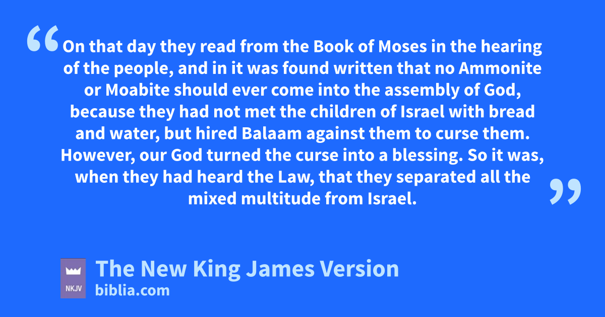 13 On that day athey read from the Book of Moses in the hearing of the people, and in it was found written bthat no Ammonite or Moabite should ever come into the assembly of God, 2 because they had not met the children of Israel with bread and water, but chired Balaam against them to curse them. dHowever, our God turned the curse into a blessing. 3 So it was, when they had heard the Law, ethat they separated all the mixed multitude from Israel.