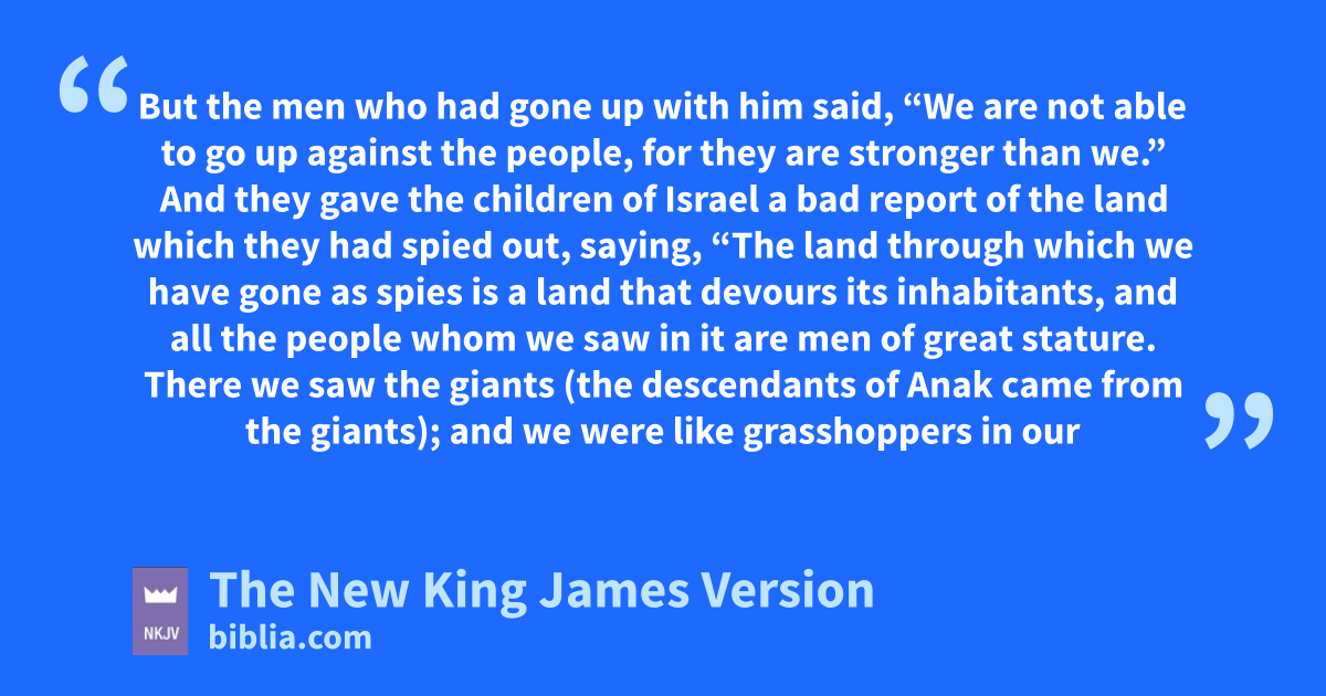 31 uBut the men who had gone up with him said, “We are not able to go up against the people, for they are stronger than we.” 32 And they vgave the children of Israel a bad report of the land which they had spied out, saying, “The land through which we have gone as spies is a land that devours its inhabitants, and wall the people whom we saw in it are men of great stature. 33 There we saw the 8giants (xthe descendants of Anak came from the giants); and we were ylike 9grasshoppers in our own sight, and so we were zin their sight.”