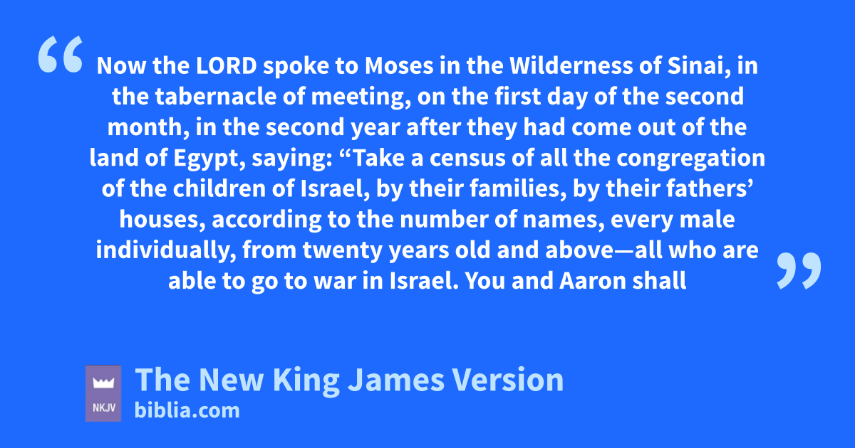 1 Now the Lord spoke to Moses ain the Wilderness of Sinai, bin the tabernacle of meeting, on the cfirst day of the second month, in the second year after they had come out of the land of Egypt, saying: 2 d“Take a census of all the congregation of the children of Israel, by their families, by their fathers’ houses, according to the number of names, every male eindividually, 3 from ftwenty years old and above—all who are able to go to war in Israel. You and Aaron shall number them by their armies. 4 And with you there shall be a man from every tribe, each one the head of his father’s house.