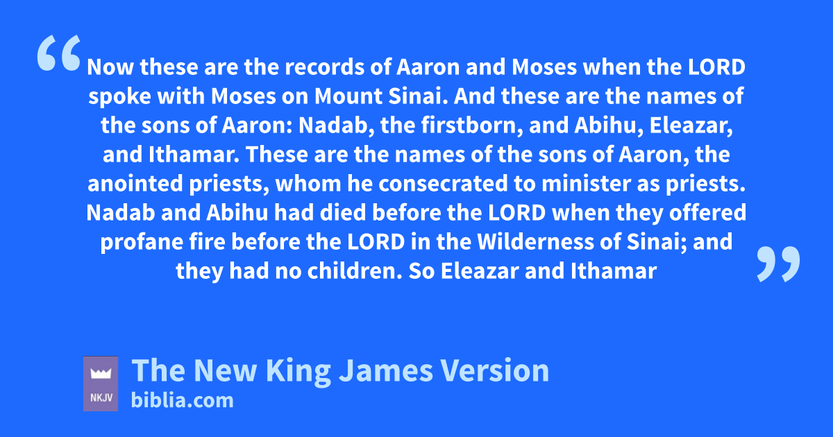 3 Now these are the arecords 1of Aaron and Moses when the Lord spoke with Moses on Mount Sinai. 2 And these are the names of the sons of Aaron: Nadab, the bfirstborn, and cAbihu, Eleazar, and Ithamar. 3 These are the names of the sons of Aaron, dthe anointed priests, 2whom he consecrated to minister as priests. 4 eNadab and Abihu had died before the Lord when they offered profane fire before the Lord in the Wilderness of Sinai; and they had no children. So Eleazar and Ithamar ministered as priests in the presence of Aaron their father.