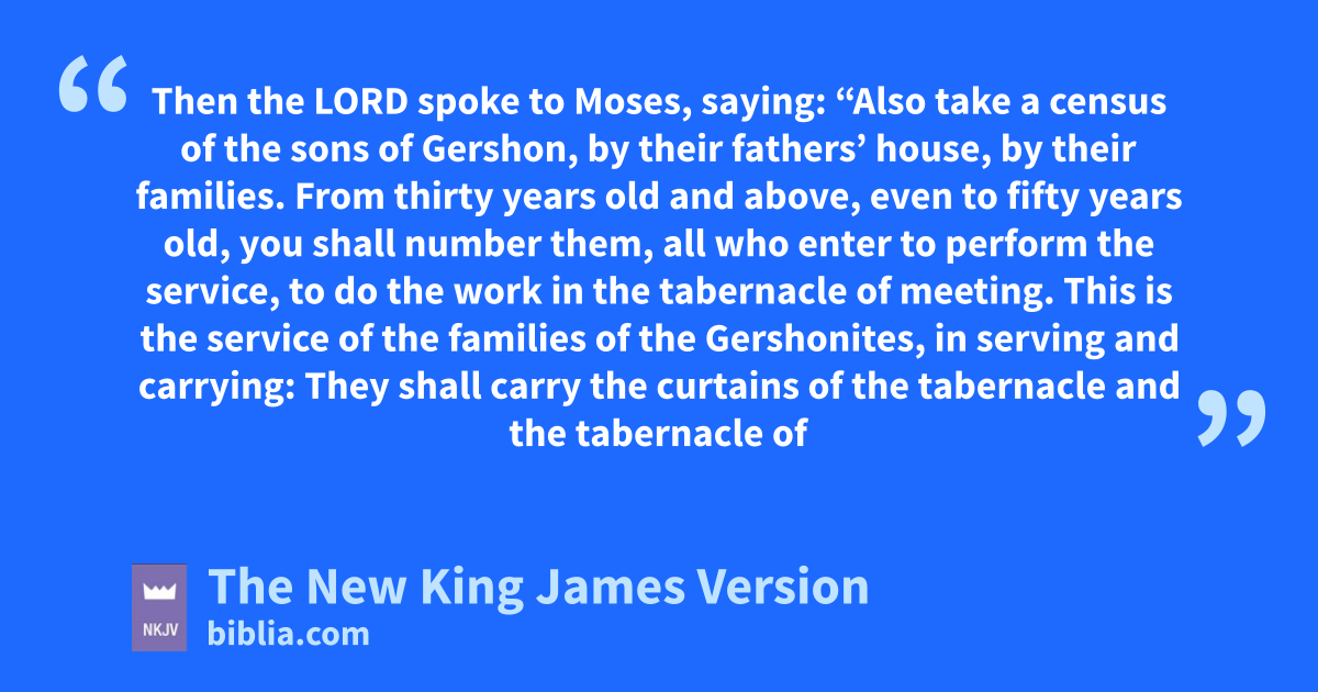 21 Then the Lord spoke to Moses, saying: 22 “Also take a census of the sons of xGershon, by their fathers’ house, by their families. 23 yFrom thirty years old and above, even to fifty years old, you shall number them, all who enter to perform the service, to do the work in the tabernacle of meeting. 24 This is the zservice of the families of the Gershonites, in serving and carrying: 25 aThey shall carry the bcurtains of the tabernacle and the tabernacle of meeting with its covering, the covering of cbadger skins that is on it, the screen for the door of the tabernacle of meeting, 26 the screen for the door of the gate of the court, the hangings of the court which are around the tabernacle and altar, and their cords, all the furnishings for their service and all that is made for these things: so shall they serve.