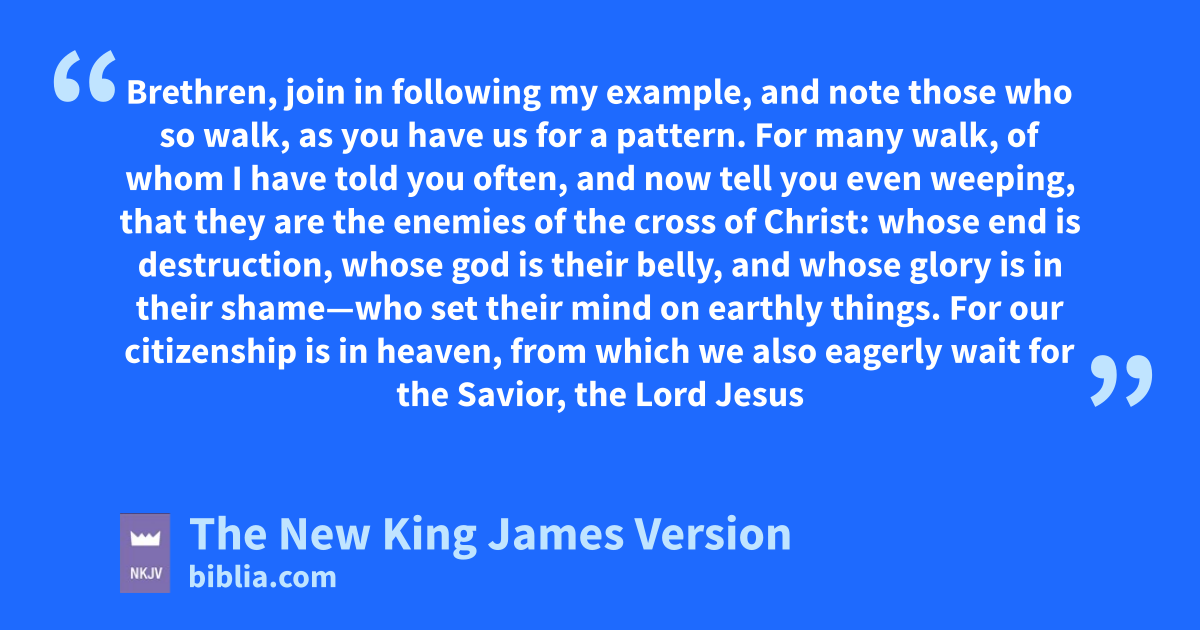 17 Brethren, ejoin in following my example, and note those who so walk, as fyou have us for a pattern. 18 For many walk, of whom I have told you often, and now tell you even weeping, that they are gthe enemies of the cross of Christ: 19 hwhose end is destruction, iwhose god is their belly, and jwhose glory is in their shame—kwho set their mind on earthly things. 20 For lour citizenship is in heaven, mfrom which we also neagerly wait for the Savior, the Lord Jesus Christ, 21 owho will transform our lowly body that it may be pconformed to His glorious body, qaccording to the working by which He is able even to rsubdue all things to Himself.