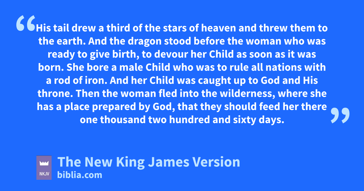 3 And another sign appeared in heaven: behold, ba great, fiery red dragon having seven heads and ten horns, and seven diadems on his heads. 4 cHis tail drew a third dof the stars of heaven eand threw them to the earth. And the dragon stood fbefore the woman who was ready to give birth, gto devour her Child as soon as it was born. 5 She bore a male Child hwho was to rule all nations with a rod of iron. And her Child was icaught up to God and His throne. 6 Then jthe woman fled into the wilderness, where she has a place prepared by God, that they should feed her there kone thousand two hundred and sixty days.