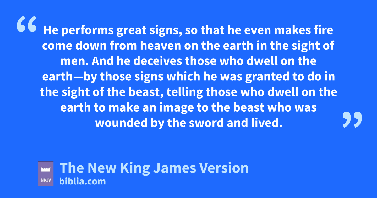 11 Then I saw another beast scoming up out of the earth, and he had two horns like a lamb and spoke like a dragon. 12 And he exercises all the authority of the first beast in his presence, and causes the earth and those who dwell in it to worship the first beast, twhose deadly wound was healed. 13 uHe performs great signs, vso that he even makes fire come down from heaven on the earth in the sight of men. 14 wAnd he deceives 6those who dwell on the earth—xby those signs which he was granted to do in the sight of the beast, telling those who dwell on the earth to make an image to the beast who was wounded by the sword yand lived. 15 He was granted power to give breath to the image of the beast, that the image of the beast should both speak zand cause as many as would not worship the image of the beast to be killed. 16 He causes all, both small and great, rich and poor, free and slave, ato receive a mark on their right hand or on their foreheads, 17 and that no one may buy or sell except one who has 7the mark or bthe name of the beast, cor the number of his name.