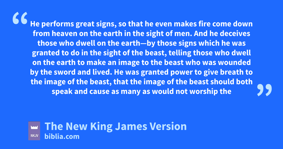 11 Then I saw another beast scoming up out of the earth, and he had two horns like a lamb and spoke like a dragon. 12 And he exercises all the authority of the first beast in his presence, and causes the earth and those who dwell in it to worship the first beast, twhose deadly wound was healed. 13 uHe performs great signs, vso that he even makes fire come down from heaven on the earth in the sight of men. 14 wAnd he deceives 6those who dwell on the earth—xby those signs which he was granted to do in the sight of the beast, telling those who dwell on the earth to make an image to the beast who was wounded by the sword yand lived. 15 He was granted power to give breath to the image of the beast, that the image of the beast should both speak zand cause as many as would not worship the image of the beast to be killed. 16 He causes all, both small and great, rich and poor, free and slave, ato receive a mark on their right hand or on their foreheads, 17 and that no one may buy or sell except one who has 7the mark or bthe name of the beast, cor the number of his name.