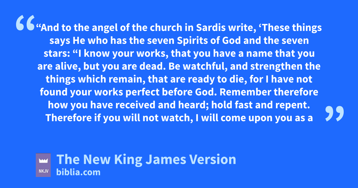 ‘These things says He who ahas the seven Spirits of God and the seven stars: “I know your works, that you have a name that you are alive, but you are dead. 2 Be watchful, and strengthen the things which remain, that are ready to die, for I have not found your works perfect before 2God. 3 bRemember therefore how you have received and heard; hold fast and crepent. dTherefore if you will not watch, I will come upon you eas a thief, and you will not know what hour I will come upon you. 4 3You have fa few names 4even in Sardis who have not gdefiled their garments; and they shall walk with Me hin white, for they are worthy. 5 He who overcomes ishall be clothed in white garments, and I will not jblot out his name from the kBook of Life; but lI will confess his name before My Father and before His angels.
