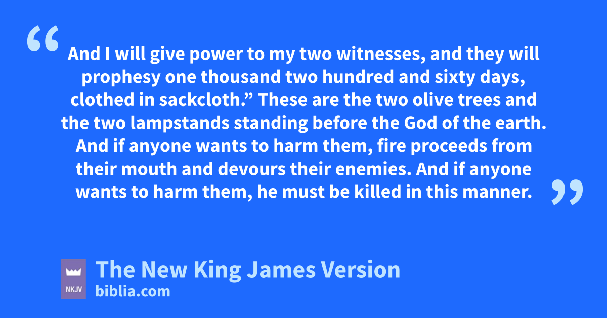 4 These are the jtwo olive trees and the two lampstands standing before the 2God of the earth. 5 And if anyone wants to harm them, kfire proceeds from their mouth and devours their enemies. lAnd if anyone wants to harm them, he must be killed in this manner. 6 These mhave power to shut heaven, so that no rain falls in the days of their prophecy; and they have power over waters to turn them to blood, and to strike the earth with all plagues, as often as they desire.