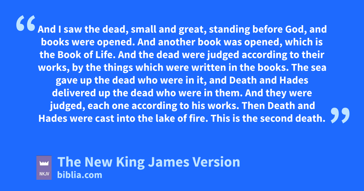 11 Then I saw a great white throne and Him who sat on it, from whose face uthe earth and the heaven fled away. vAnd there was found no place for them. 12 And I saw the dead, wsmall and great, standing before 3God, xand books were opened. And another ybook was opened, which is the Book of Life. And the dead were judged zaccording to their works, by the things which were written in the books. 13 The sea gave up the dead who were in it, aand Death and Hades delivered up the dead who were in them. bAnd they were judged, each one according to his works. 14 Then cDeath and Hades were cast into the lake of fire. dThis is the second 4death. 15 And anyone not found written in the Book of Life ewas cast into the lake of fire.