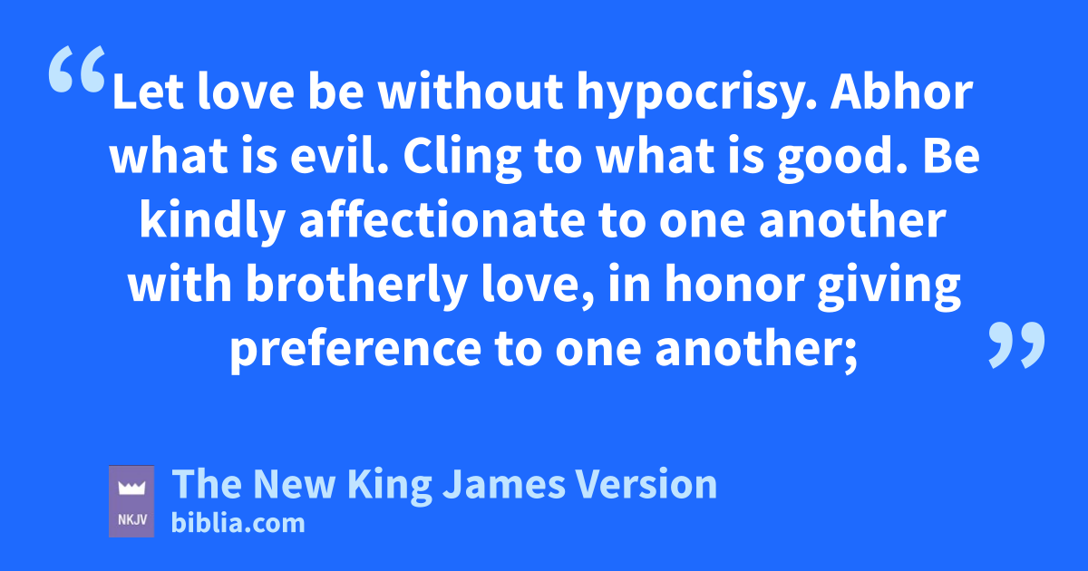 9 rLet love be without hypocrisy. sAbhor what is evil. Cling to what is good. 10 tBe kindly affectionate to one another with brotherly love, uin honor giving preference to one another; 11 not lagging in diligence, fervent in spirit, serving the Lord; 12 vrejoicing in hope, wpatient 3in tribulation, xcontinuing steadfastly in prayer; 13 ydistributing to the needs of the saints, zgiven 4to hospitality.