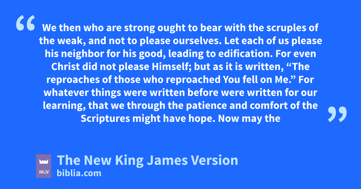 15 We athen who are strong ought to bear with the 1scruples of the weak, and not to please ourselves. 2 bLet each of us please his neighbor for his good, leading to 2edification. 3 cFor even Christ did not please Himself; but as it is written, d“The reproaches of those who reproached You fell on Me.” 4 For ewhatever things were written before were written for our learning, that we through the 3patience and comfort of the Scriptures might have hope. 5 fNow may the God of patience and comfort grant you to be like-minded toward one another, according to Christ Jesus, 6 that you may gwith one mind and one mouth glorify the God and Father of our Lord Jesus Christ.
