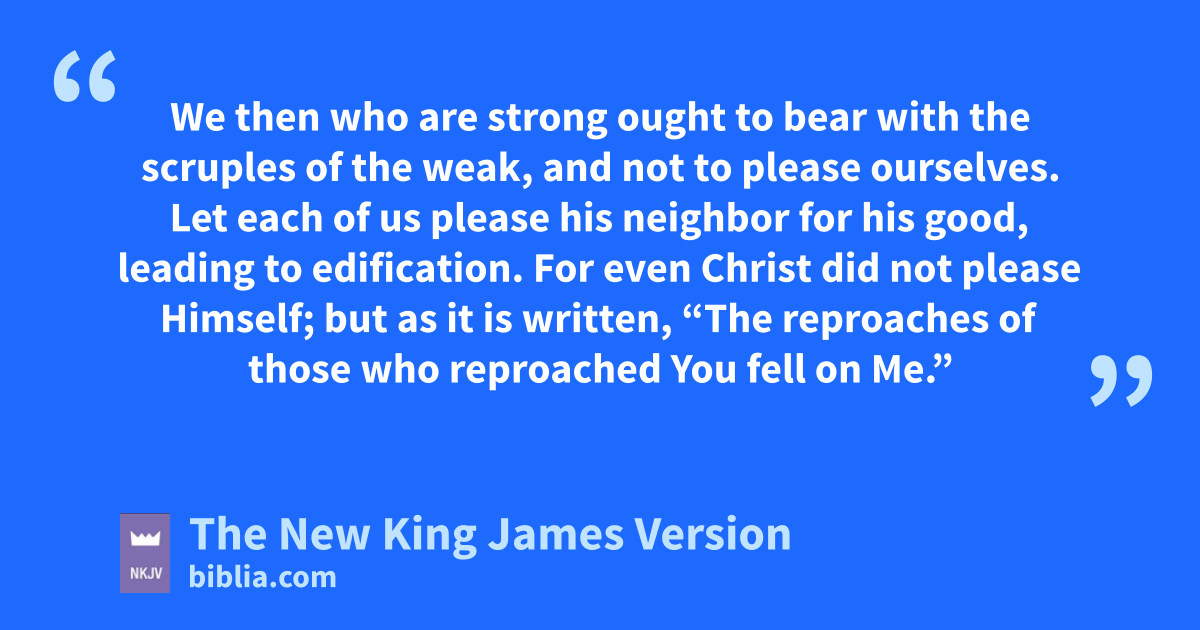 15 We athen who are strong ought to bear with the 1scruples of the weak, and not to please ourselves. 2 bLet each of us please his neighbor for his good, leading to 2edification. 3 cFor even Christ did not please Himself; but as it is written, d“The reproaches of those who reproached You fell on Me.” 4 For ewhatever things were written before were written for our learning, that we through the 3patience and comfort of the Scriptures might have hope. 5 fNow may the God of patience and comfort grant you to be like-minded toward one another, according to Christ Jesus, 6 that you may gwith one mind and one mouth glorify the God and Father of our Lord Jesus Christ.