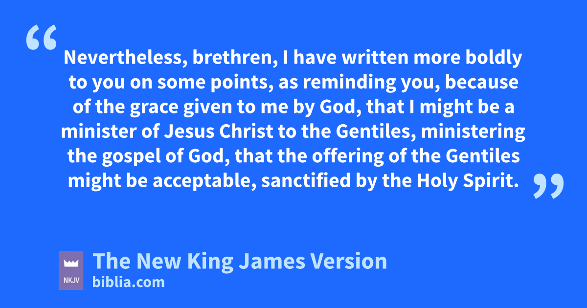14 Now rI myself am confident concerning you, my brethren, that you also are full of goodness, sfilled with all knowledge, able also to admonish 6one another. 15 Nevertheless, brethren, I have written more boldly to you on some points, as reminding you, tbecause of the grace given to me by God, 16 that uI might be a minister of Jesus Christ to the Gentiles, ministering the gospel of God, that the voffering 7of the Gentiles might be acceptable, sanctified by the Holy Spirit. 17 Therefore I have reason to glory in Christ Jesus win the things which pertain to God. 18 For I will not dare to speak of any of those things xwhich Christ has not accomplished through me, in word and deed, yto make the Gentiles obedient—19 zin mighty signs and wonders, by the power of the Spirit of God, so that from Jerusalem and round about to Illyricum I have fully preached the gospel of Christ. 20 And so I have made it my aim to preach the gospel, not where Christ was named, alest I should build on another man’s foundation, 21 but as it is written:
