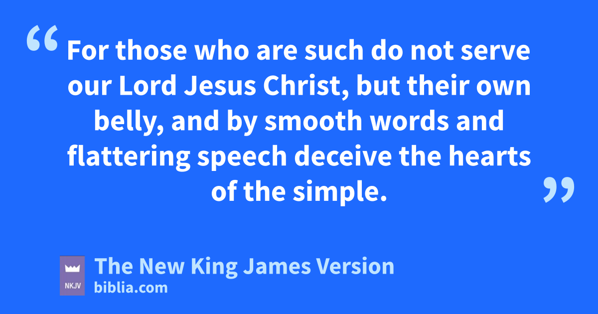 17 Now I urge you, brethren, note those kwho cause divisions and offenses, contrary to the doctrine which you learned, and lavoid them. 18 For those who are such do not serve our Lord 4Jesus Christ, but mtheir own belly, and nby smooth words and flattering speech deceive the hearts of the simple. 19 For oyour obedience has become known to all. Therefore I am glad on your behalf; but I want you to be pwise in what is good, and 5simple concerning evil. 20 And qthe God of peace rwill crush Satan under your feet shortly.