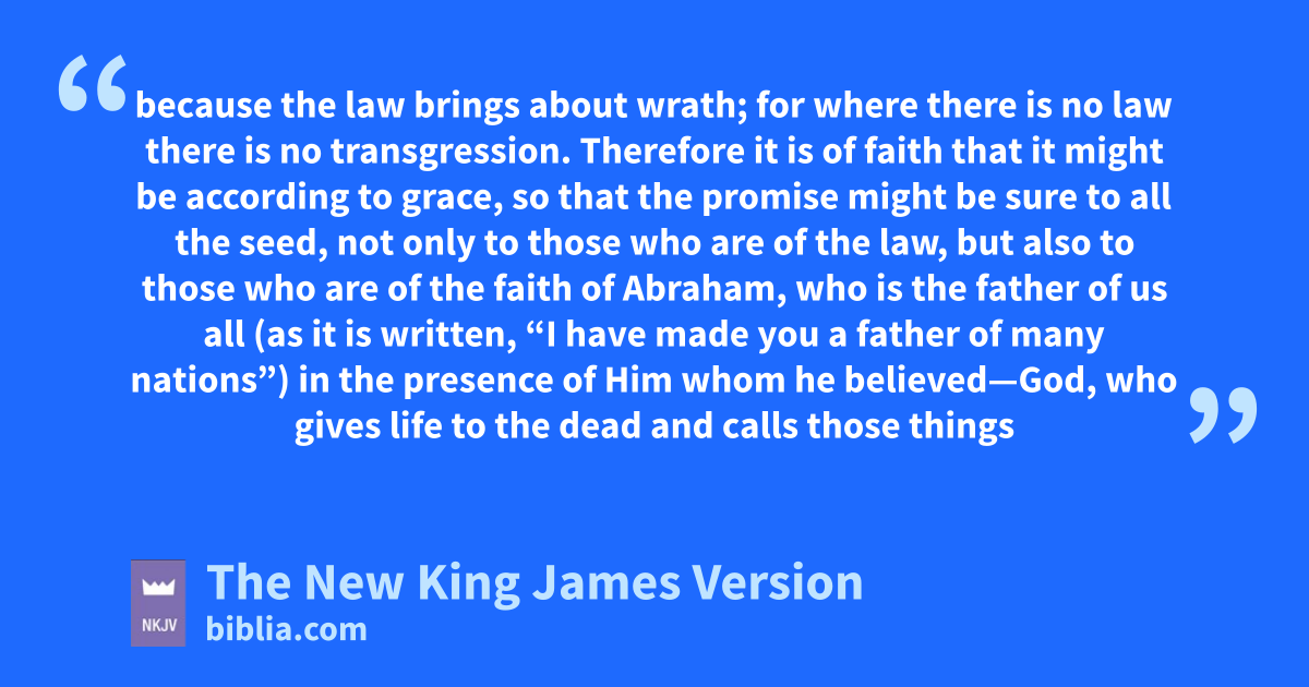 16 Therefore it is of faith that it might be paccording to grace, qso that the promise might be 4sure to all the seed, not only to those who are of the law, but also to those who are of the faith of Abraham, rwho is the father of us all 17 (as it is written, s“I have made you a father of many nations”) in the presence of Him whom he believed—God, twho gives life to the dead and calls those uthings which do not exist as though they did; 18 who, contrary to hope, in hope believed, so that he became the father of many nations, according to what was spoken, v“So shall your descendants be.” 19 And not being weak in faith, whe did not consider his own body, already dead (since he was about a hundred years old), xand the deadness of Sarah’s womb. 20 He did not waver at the promise of God through unbelief, but was strengthened in faith, giving glory to God, 21 and being fully convinced that what He had promised yHe was also able to perform. 22 And therefore z“it was accounted to him for righteousness.”
