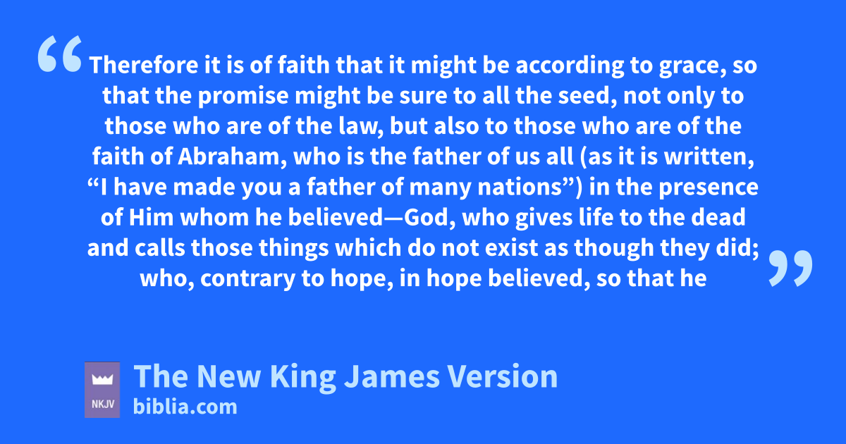 16 Therefore it is of faith that it might be paccording to grace, qso that the promise might be 4sure to all the seed, not only to those who are of the law, but also to those who are of the faith of Abraham, rwho is the father of us all 17 (as it is written, s“I have made you a father of many nations”) in the presence of Him whom he believed—God, twho gives life to the dead and calls those uthings which do not exist as though they did; 18 who, contrary to hope, in hope believed, so that he became the father of many nations, according to what was spoken, v“So shall your descendants be.” 19 And not being weak in faith, whe did not consider his own body, already dead (since he was about a hundred years old), xand the deadness of Sarah’s womb. 20 He did not waver at the promise of God through unbelief, but was strengthened in faith, giving glory to God, 21 and being fully convinced that what He had promised yHe was also able to perform. 22 And therefore z“it was accounted to him for righteousness.”