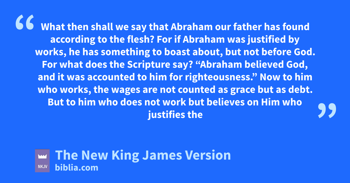 4 What then shall we say that aAbraham our bfather 1has found according to the flesh? 2 For if Abraham was cjustified by works, he has something to boast about, but not before God. 3 For what does the Scripture say? d“Abraham believed God, and it was 2accounted to him for righteousness.” 4 Now eto him who works, the wages are not counted 3as grace but 3as debt.