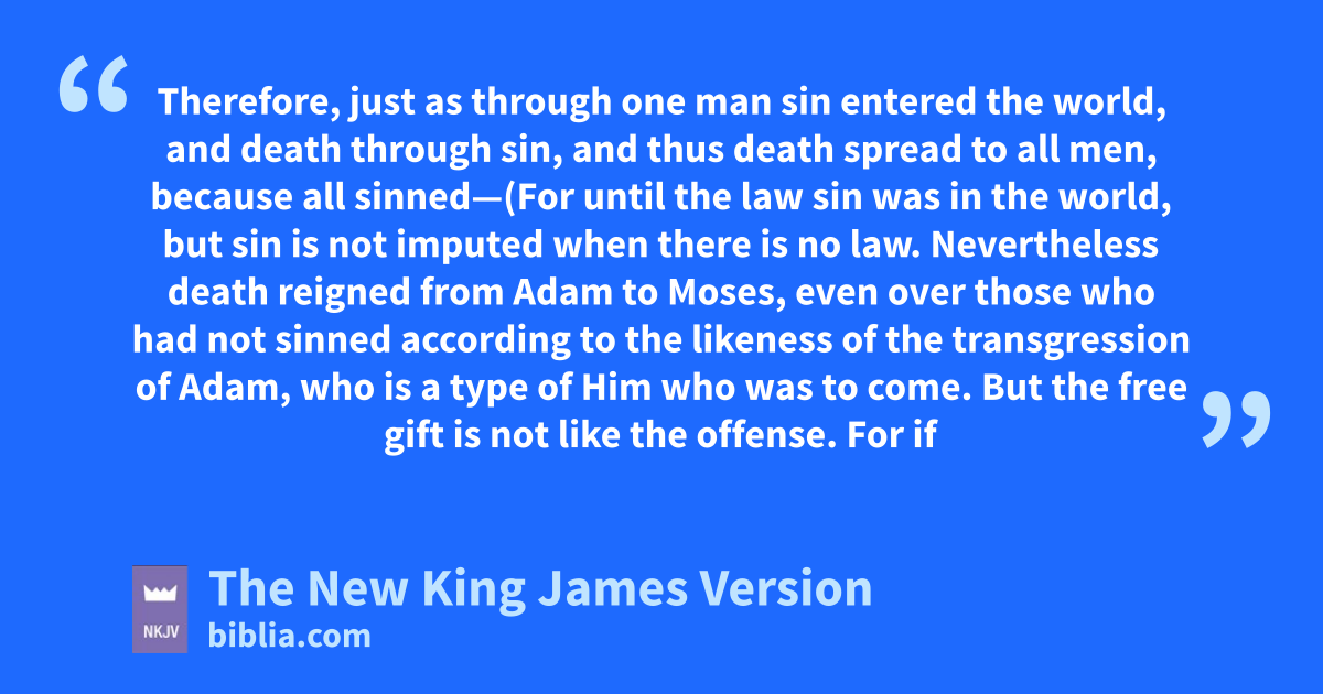 12 Therefore, just as sthrough one man sin entered the world, and tdeath through sin, and thus death spread to all men, because all sinned—13 (For until the law sin was in the world, but usin is not imputed when there is no law. 14 Nevertheless death reigned from Adam to Moses, even over those who had not sinned according to the likeness of the transgression of Adam, vwho is a type of Him who was to come. 15 But the free gift is not like the 5offense. For if by the one man’s offense many died, much more the grace of God and the gift by the grace of the one Man, Jesus Christ, abounded wto many. 16 And the gift is not like that which came through the one who sinned. For the judgment which came from one offense resulted in condemnation, but the free gift which came from many 6offenses resulted in justification. 17 For if by the one man’s 7offense death reigned through the one, much more those who receive abundance of grace and of the gift of righteousness will reign in life through the One, Jesus Christ.)