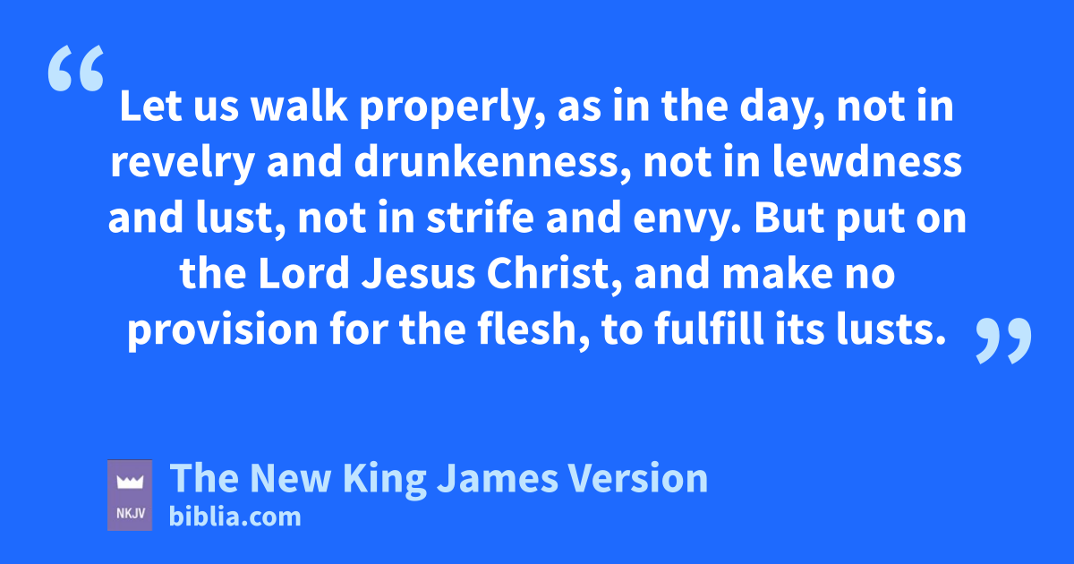 11 And do this, knowing the time, that now it is high time kto awake out of sleep; for now our salvation is nearer than when we first believed. 12 The night is far spent, the day is at hand. lTherefore let us cast off the works of darkness, and mlet us put on the armor of light. 13 nLet us walk 3properly, as in the day, onot in revelry and drunkenness, pnot in lewdness and lust, qnot in strife and envy. 14 But rput on the Lord Jesus Christ, and smake no provision for the flesh, to fulfill its lusts.