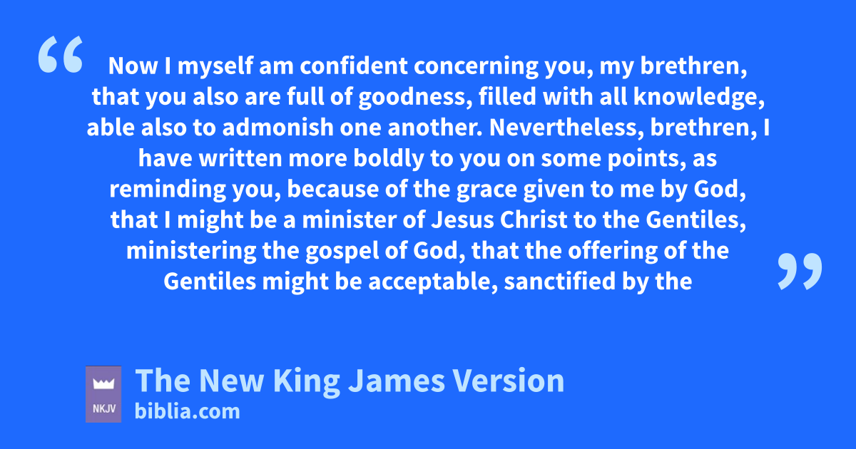 14 Now rI myself am confident concerning you, my brethren, that you also are full of goodness, sfilled with all knowledge, able also to admonish 6one another. 15 Nevertheless, brethren, I have written more boldly to you on some points, as reminding you, tbecause of the grace given to me by God, 16 that uI might be a minister of Jesus Christ to the Gentiles, ministering the gospel of God, that the voffering 7of the Gentiles might be acceptable, sanctified by the Holy Spirit. 17 Therefore I have reason to glory in Christ Jesus win the things which pertain to God. 18 For I will not dare to speak of any of those things xwhich Christ has not accomplished through me, in word and deed, yto make the Gentiles obedient—19 zin mighty signs and wonders, by the power of the Spirit of God, so that from Jerusalem and round about to Illyricum I have fully preached the gospel of Christ. 20 And so I have made it my aim to preach the gospel, not where Christ was named, alest I should build on another man’s foundation, 21 but as it is written: