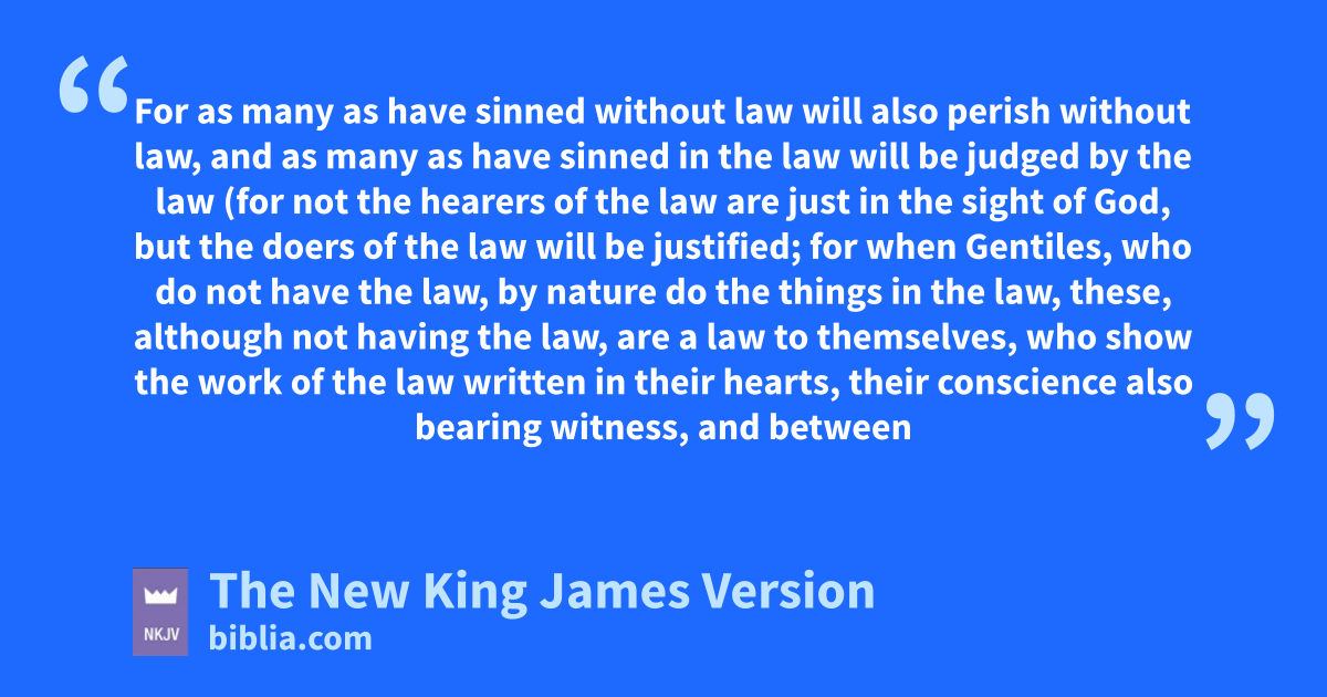 12 For as many as have sinned without law will also perish without law, and as many as have sinned in the law will be judged by the law 13 (for mnot the hearers of the law are just in the sight of God, but the doers of the law will be justified; 14 for when Gentiles, who do not have the law, by nature do the things in the law, these, although not having the law, are a law to themselves, 15 who show the nwork of the law written in their hearts, their oconscience also bearing witness, and between themselves their thoughts accusing or else excusing them) 16 pin the day when God will judge the secrets of men qby Jesus Christ, raccording to my gospel.