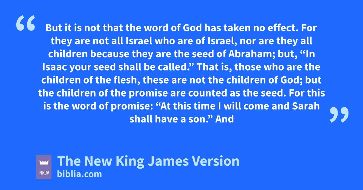 6 mBut it is not that the word of God has taken no effect. For nthey are not all Israel who are of Israel, 7 onor are they all children because they are the seed of Abraham; but, p“In Isaac your seed shall be called.” 8 That is, those who are the children of the flesh, these are not the children of God; but qthe children of the promise are counted as the seed. 9 For this is the word of promise: r“At this time I will come and Sarah shall have a son.”