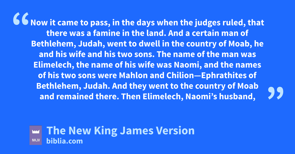 1 Now it came to pass, in the days when athe judges 1ruled, that there was ba famine in the land. And a certain man of cBethlehem, Judah, went to 2dwell in the country of dMoab, he and his wife and his two sons. 2 The name of the man was Elimelech, the name of his wife was Naomi, and the names of his two sons were Mahlon and Chilion—eEphrathites of Bethlehem, Judah. And they went fto the country of Moab and remained there. 3 Then Elimelech, Naomi’s husband, died; and she was left, and her two sons. 4 Now they took wives of the women of Moab: the name of the one was Orpah, and the name of the other Ruth. And they 3dwelt there about ten years. 5 Then both Mahlon and Chilion also died; so the woman survived her two sons and her husband.