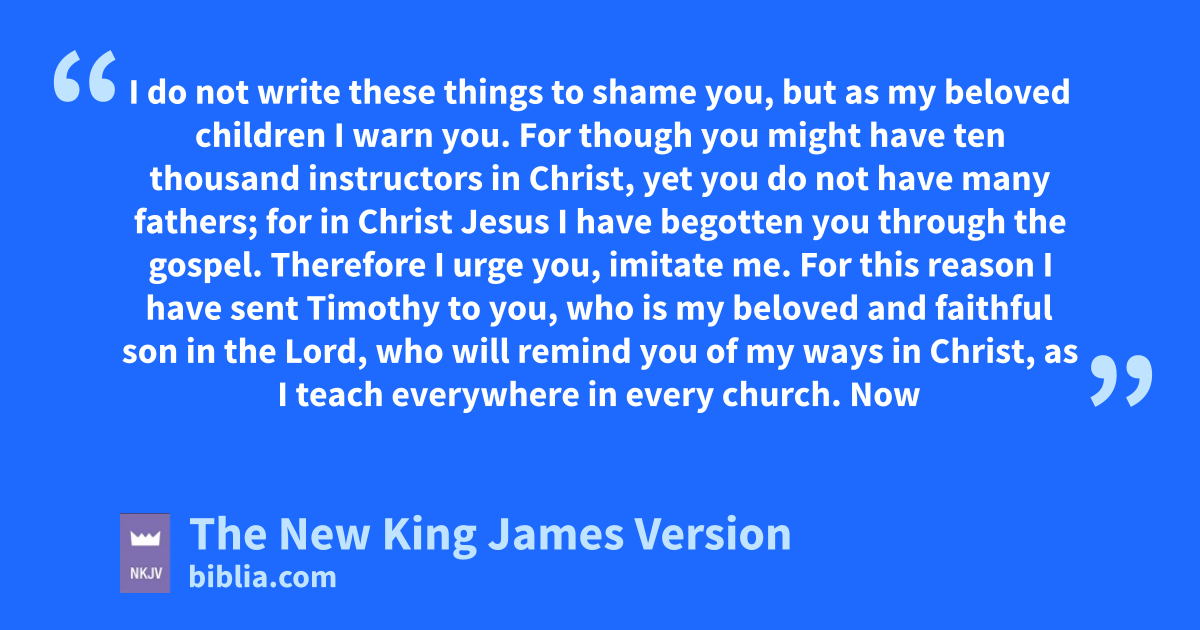 14 I do not write these things to shame you, but oas my beloved children I warn you. 15 For though you might have ten thousand instructors in Christ, yet you do not have many fathers; for pin Christ Jesus I have begotten you through the gospel. 16 Therefore I urge you, qimitate me. 17 For this reason I have sent rTimothy to you, swho is my beloved and faithful son in the Lord, who will tremind you of my ways in Christ, as I uteach everywhere vin every church.