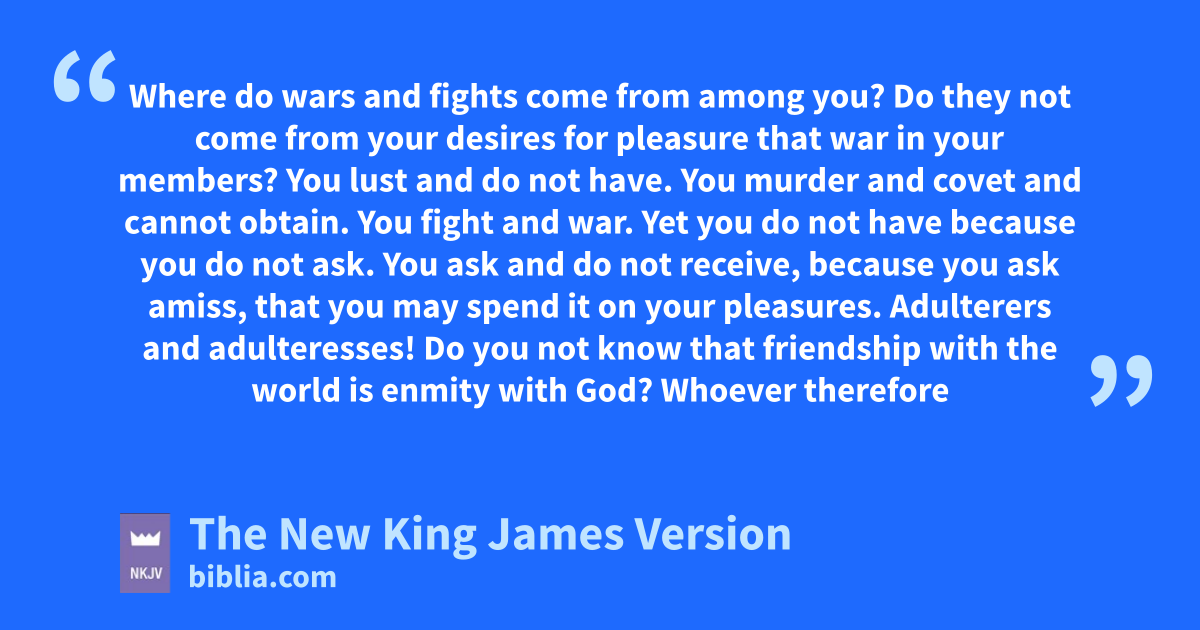 4 Where do 1wars and fights come from among you? Do they not come from your desires for pleasure athat war in your members? 2 You lust and do not have. You murder and covet and cannot obtain. You fight and 2war. 3Yet you do not have because you do not ask. 3 bYou ask and do not receive, cbecause you ask amiss, that you may spend it on your pleasures. 4 4Adulterers and adulteresses! Do you not know that dfriendship with the world is enmity with God? eWhoever therefore wants to be a friend of the world makes himself an enemy of God. 5 Or do you think that the Scripture says in vain, f“The Spirit who dwells in us yearns jealously”?