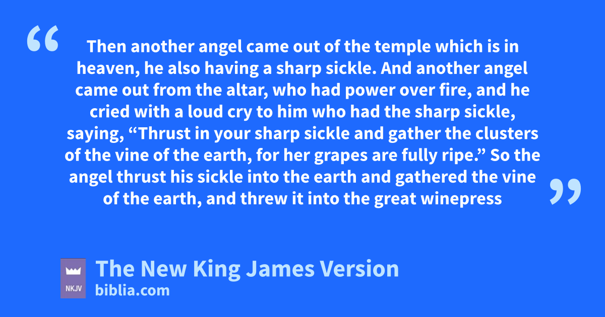 18 And another angel came out from the altar, kwho had power over fire, and he cried with a loud cry to him who had the sharp sickle, saying, l“Thrust in your sharp sickle and gather the clusters of the vine of the earth, for her grapes are fully ripe.” 19 So the angel thrust his sickle into the earth and gathered the vine of the earth, and threw it into mthe great winepress of the wrath of God. 20 And nthe winepress was trampled ooutside the city, and blood came out of the winepress, pup to the horses’ bridles, for one thousand six hundred 2furlongs.
