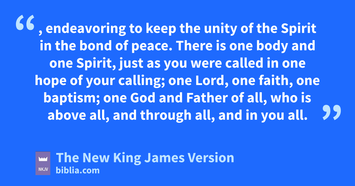 4 I, therefore, the prisoner 1of the Lord, 2beseech you to awalk worthy of the calling with which you were called, 2 with all lowliness and gentleness, with longsuffering, bearing with one another in love, 3 endeavoring to keep the unity of the Spirit bin the bond of peace. 4 cThere is one body and one Spirit, just as you were called in one hope of your calling; 5 done Lord, eone faith, fone baptism; 6 gone God and Father of all, who is above all, and hthrough all, and in 3you all.