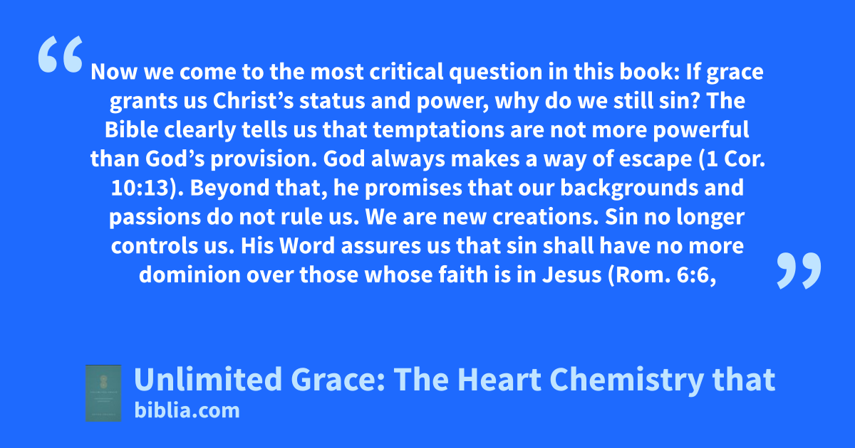 Now we come to the most critical question in this book: If grace grants us Christ’s status and power, why do we still sin? The Bible clearly tells us that temptations are not more powerful than God’s provision. God always makes a way of escape (1 Cor. 10:13). Beyond that, he promises that our backgrounds and passions do not rule us. We are new creations. Sin no longer controls us. His Word assures us that sin shall have no more dominion over those whose faith is in Jesus (Rom. 6:6,