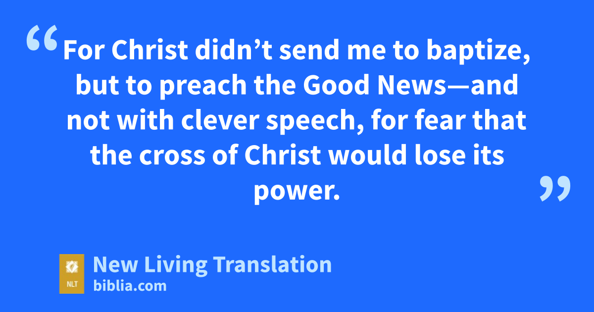 13 Has Christ been divided into factions? Was I, Paul, crucified for you? Were any of you baptized in the name of Paul? Of course not! 14 I thank God that I did not baptize any of you except Crispus and Gaius, 15 for now no one can say they were baptized in my name. 16 (Oh yes, I also baptized the household of Stephanas, but I don’t remember baptizing anyone else.) 17 For Christ didn’t send me to baptize, but to preach the Good News—and not with clever speech, for fear that the cross of Christ would lose its power.