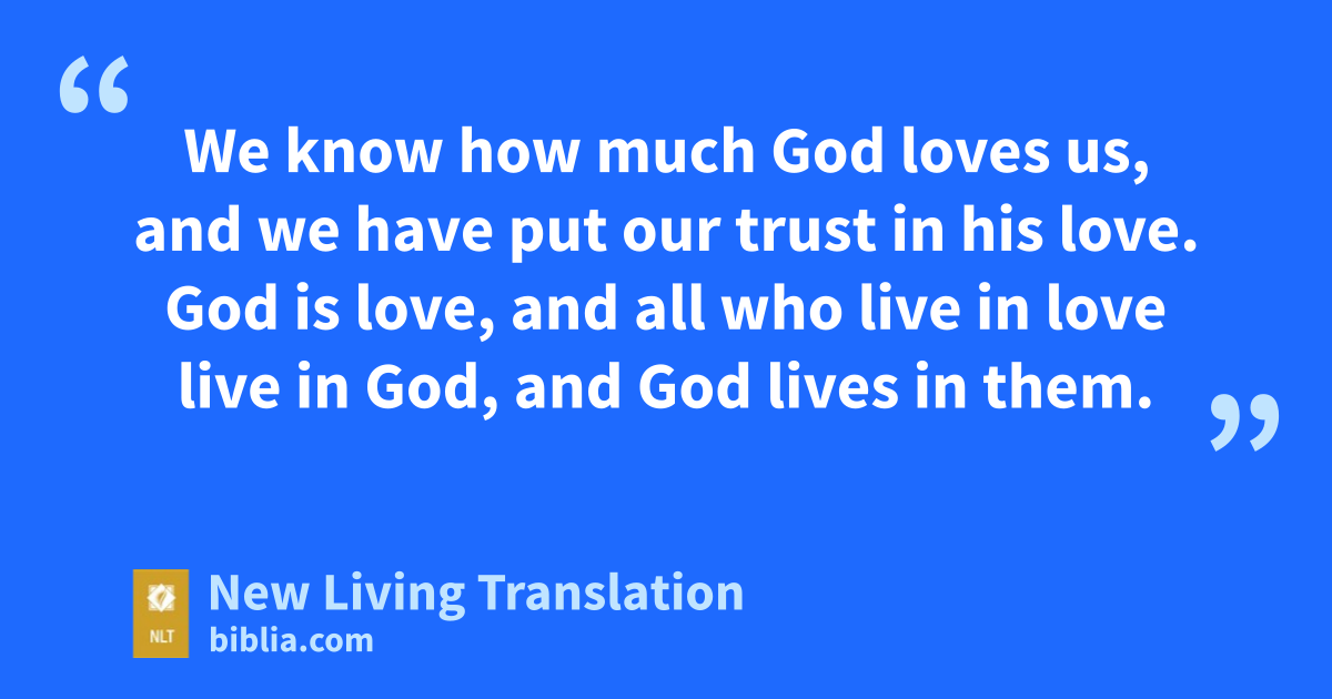 13 And God has given us his Spirit as proof that we live in him and he in us. 14 Furthermore, we have seen with our own eyes and now testify that the Father sent his Son to be the Savior of the world. 15 All who declare that Jesus is the Son of God have God living in them, and they live in God. 16 We know how much God loves us, and we have put our trust in his love.