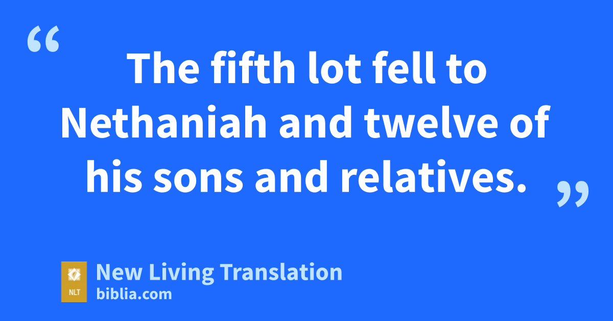 12 The fifth lot fell to Nethaniah and twelve of his sons and relatives.
