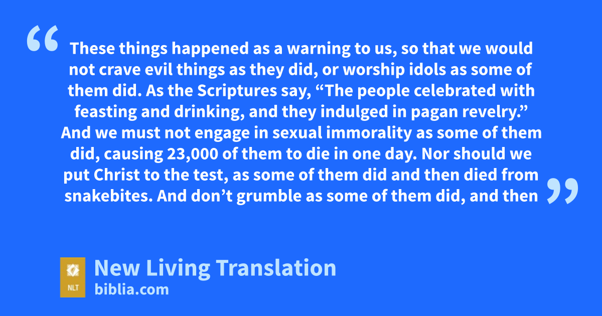 6 These things happened as a warning to us, so that we would not crave evil things as they did, 7 or worship idols as some of them did. As the Scriptures say, “The people celebrated with feasting and drinking, and they indulged in pagan revelry.”* 8 And we must not engage in sexual immorality as some of them did, causing 23,000 of them to die in one day.