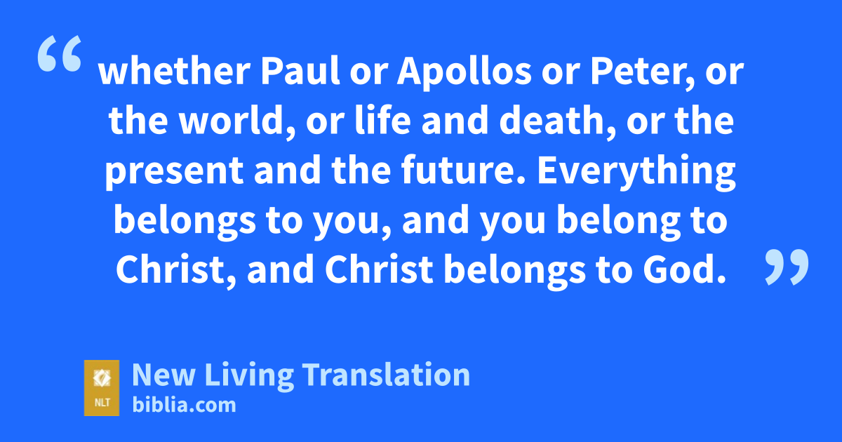 21 So don’t boast about following a particular human leader. For everything belongs to you—22 whether Paul or Apollos or Peter,* or the world, or life and death, or the present and the future. Everything belongs to you, 23 and you belong to Christ, and Christ belongs to God.