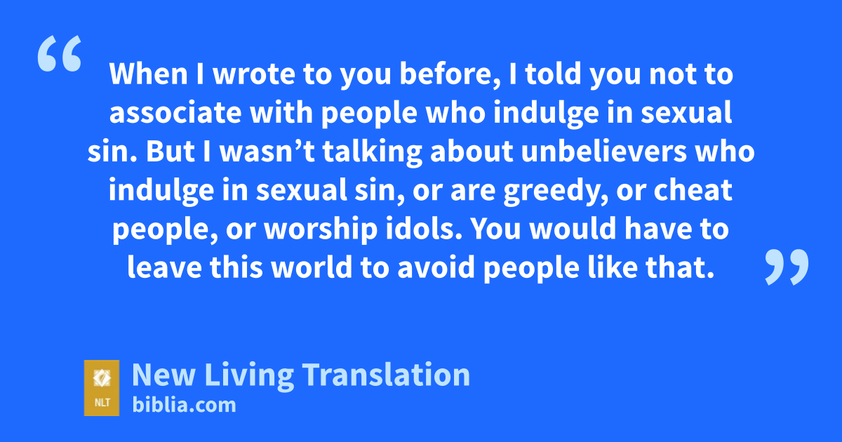 9 When I wrote to you before, I told you not to associate with people who indulge in sexual sin. 10 But I wasn’t talking about unbelievers who indulge in sexual sin, or are greedy, or cheat people, or worship idols. You would have to leave this world to avoid people like that. 11 I meant that you are not to associate with anyone who claims to be a believer* yet indulges in sexual sin, or is greedy, or worships idols, or is abusive, or is a drunkard, or cheats people. Don’t even eat with such people.