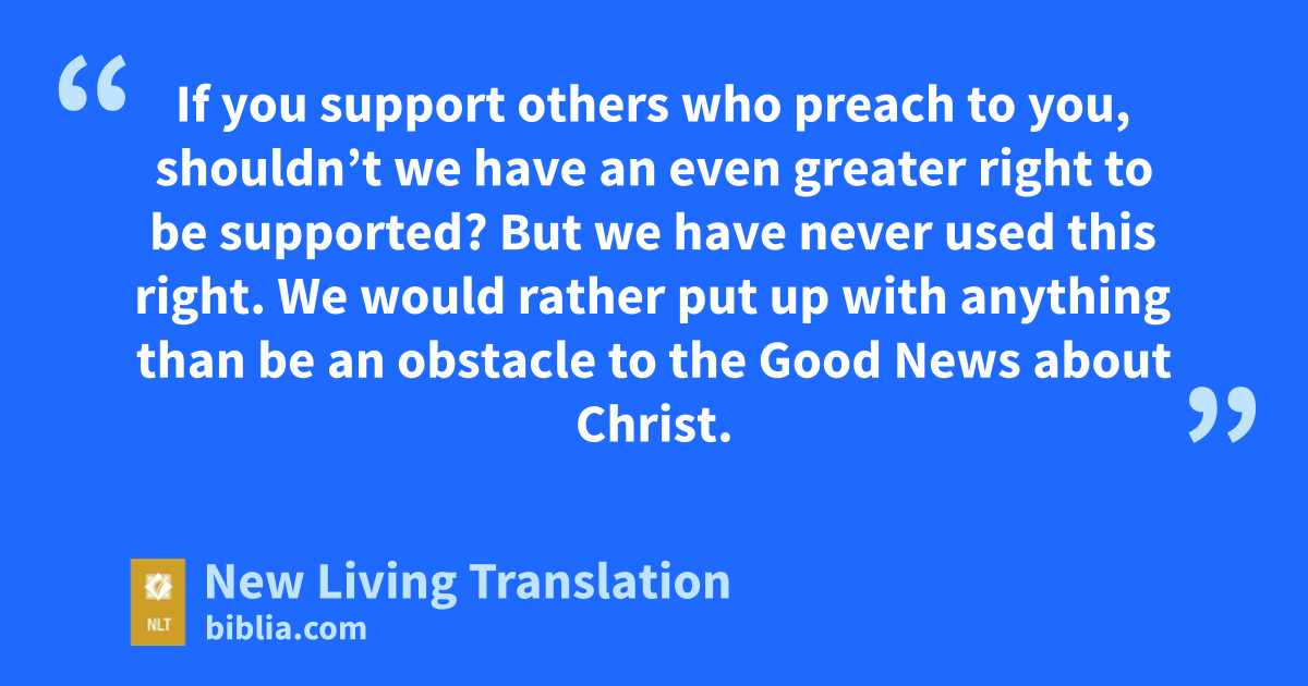 11 Since we have planted spiritual seed among you, aren’t we entitled to a harvest of physical food and drink? 12 If you support others who preach to you, shouldn’t we have an even greater right to be supported? But we have never used this right. We would rather put up with anything than be an obstacle to the Good News about Christ.
